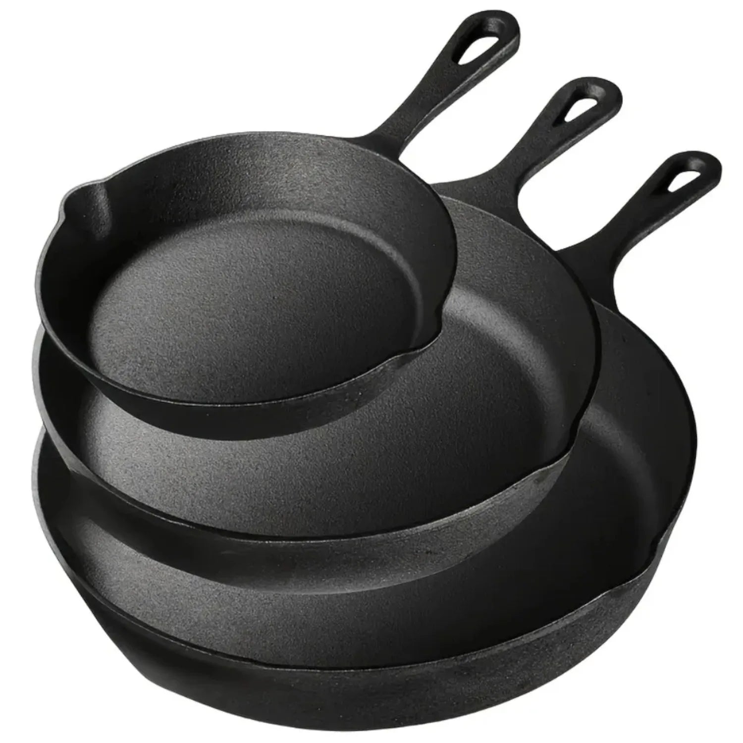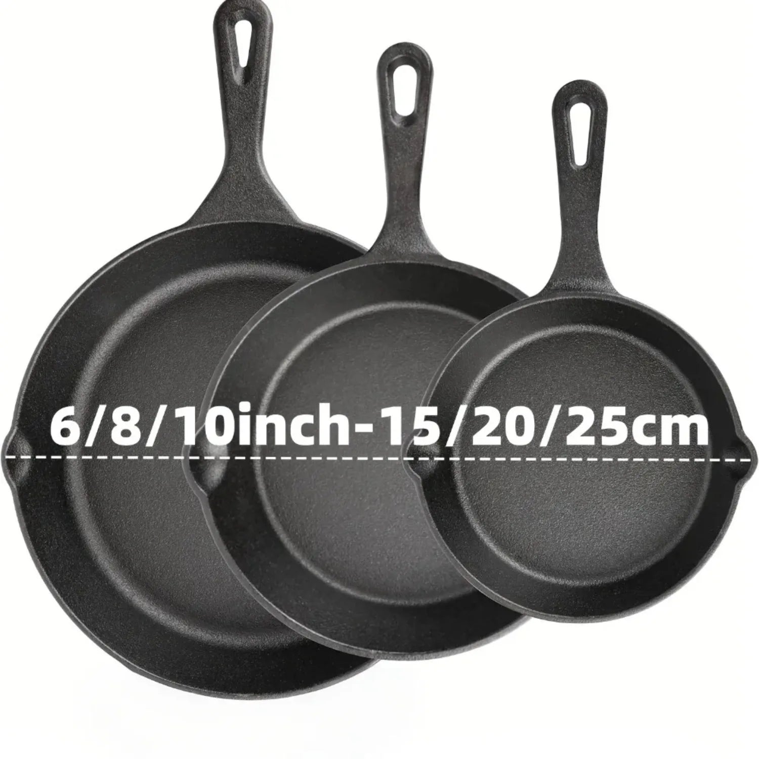 Cook like a pro with this 3-piece Cast Iron Skillet Set. Featuring 6, 8, and 10-inch pans, perfect for all your cooking needs. Each skillet is pre-seasoned for a natural non-stick surface, allowing for even heat distribution and excellent searing, frying, and baking results.